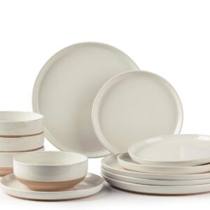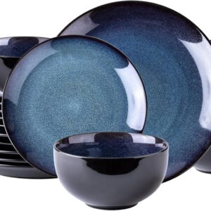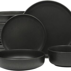 16 Piece (Service for 4) Plates and Bowls Double Bowl Reactive Glaze Dishes Stoneware Ceramic Dinnerware Set – Black