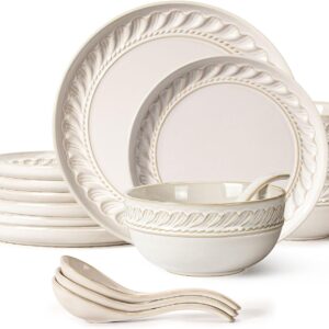 Service for 4, 16-piece Dinnerware sets with pasta bowls will satisfy all your dining needs for a dinner party of 4, contains 4pcs 10.43” dinner plates, 4pcs 7.9” salad plates, 4pcs 5.8”/22oz cereal bowls, 4pcs 8.07”/37oz pasta bowls, proper size for serving various cuisine, perfect for family, party, entertaining, restaurant and hotel