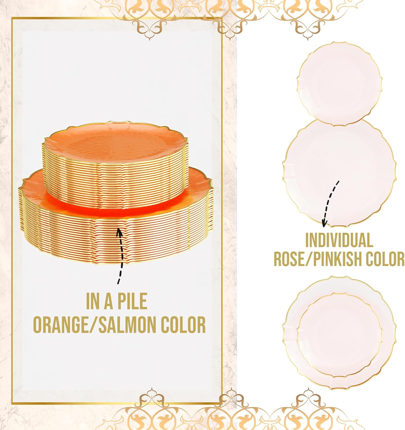 Exquisite Tinted Plates – 80 Piece Plastic Disposable Party Set for 40 Guests – 40 X 7.5 Dessert & 40 X 10 Thin Delicate Fancy Plates – Coral Peach with Gold Rim