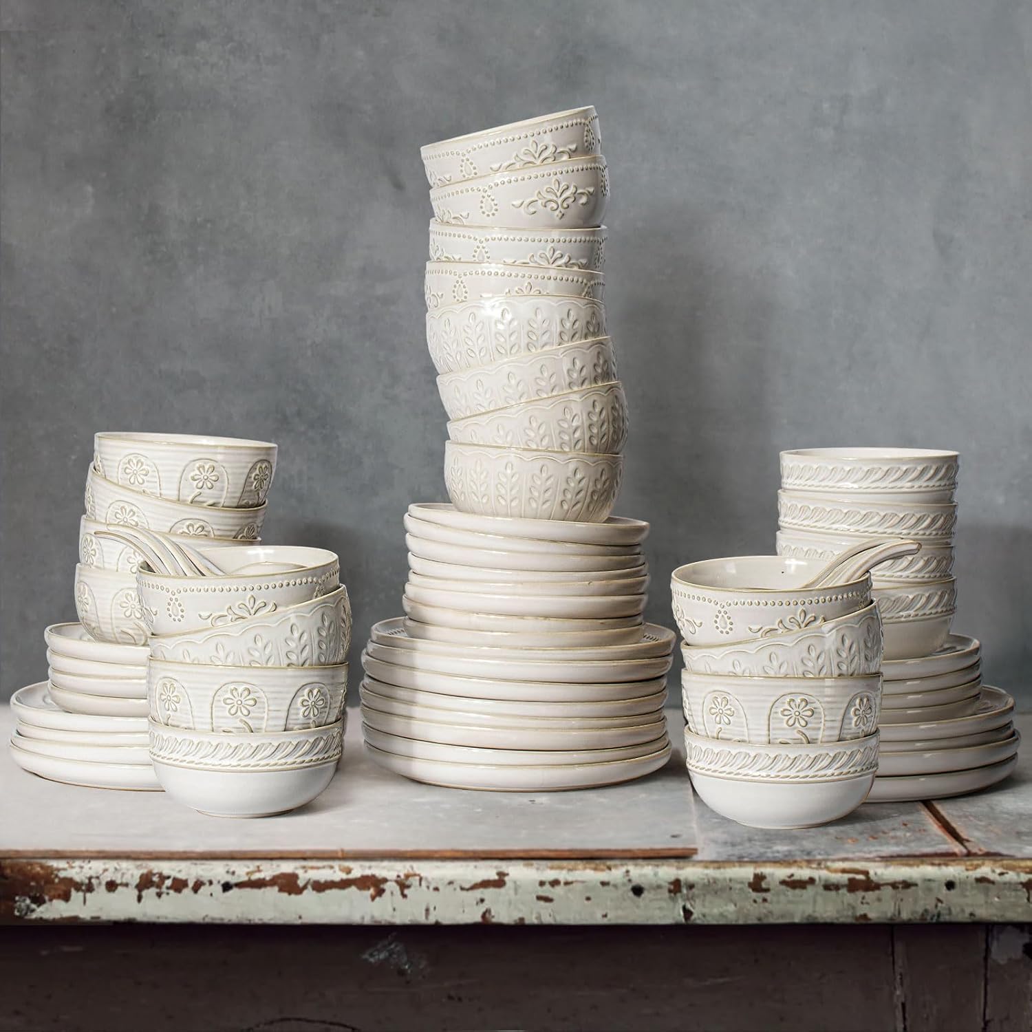 • 【Handcrafted Embossment & Unique Reaction Glaze】 The surface of every plates and bowls sets have different reaction glazing texture and embossment patterns that makes these more interesting than plain white dishes and to make your food look more delicious. The patterns are super charming. The texture adds gorgeous detail as well