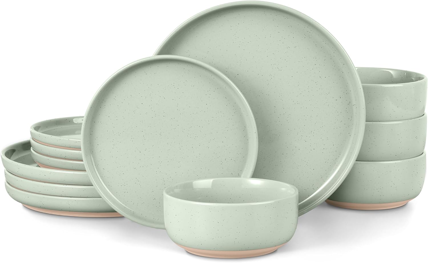 Porcelain Dinnerware Set for 4, 12 PC Stoneware Dinner Plates and Bowls, Ceramic Dining Dishes Set for Dessert Salad Pasta, Microwave & Dishwasher Safe, Fog Green